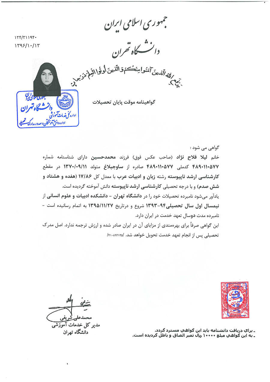 لیسانس و فوق لیسانس زبان و ادبیات عرب از دانشگاه تهران،رتبه ۲۸۴کنکور سراسری در سال۸۹،مدرس دانشگاه و مراکز علمی